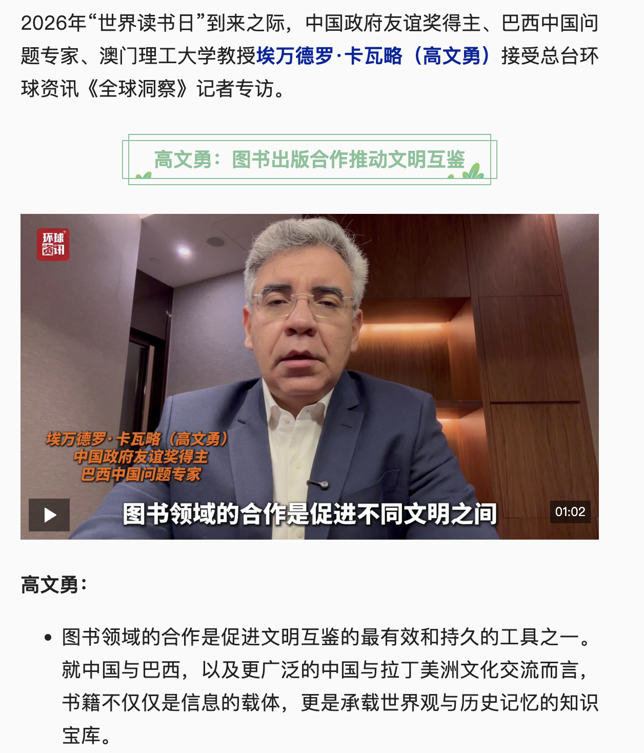 4月23日是“世界图书和版权日”(World Book and Copyright Day),也称“世界读书日”,是联合国教科文组织(UNESCO)为了推动阅读、出版及保护知识产权而设立的全球性纪念日。2026年“世界读书日”到来之际,中国政府友谊奖得主、巴西中国问题专家、澳门理工大学教授埃万德罗·卡瓦略(高文勇)接受总台环球资讯《全球洞察》记者专访。